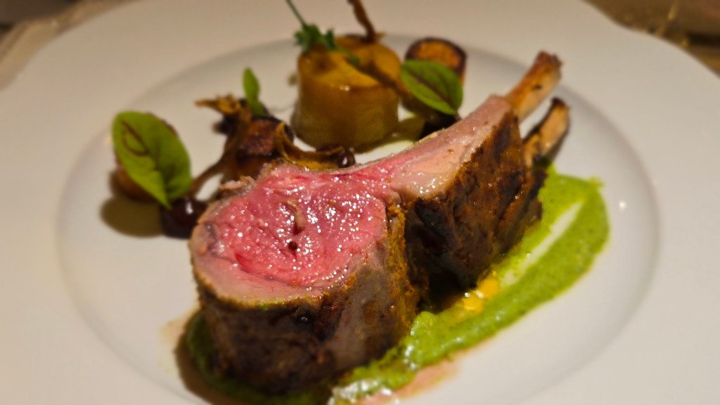 Tandoori rack of lamb with coriander-mint coulis, Bombay potatoes, prune-anise puree, and pea tendrils ; food by Steve Konarik, image by Tony Dina 2025